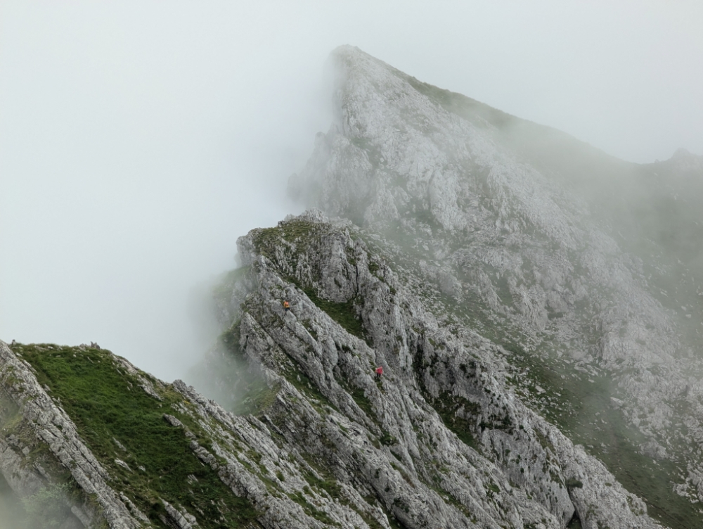 Una vez en el cordal seguimos el pequeño tramo de cresta, con pasos bastante aéreos a la izquierda hasta llegar a la cima.