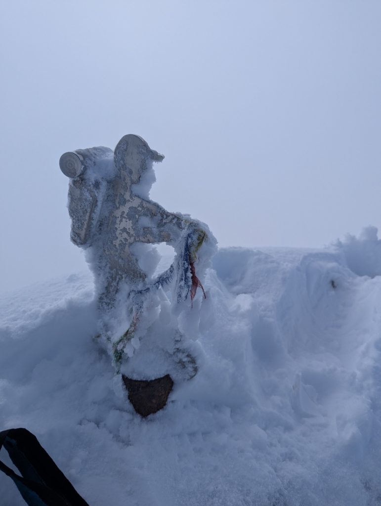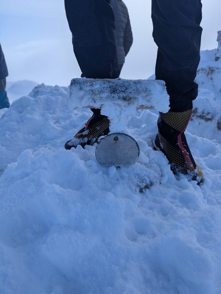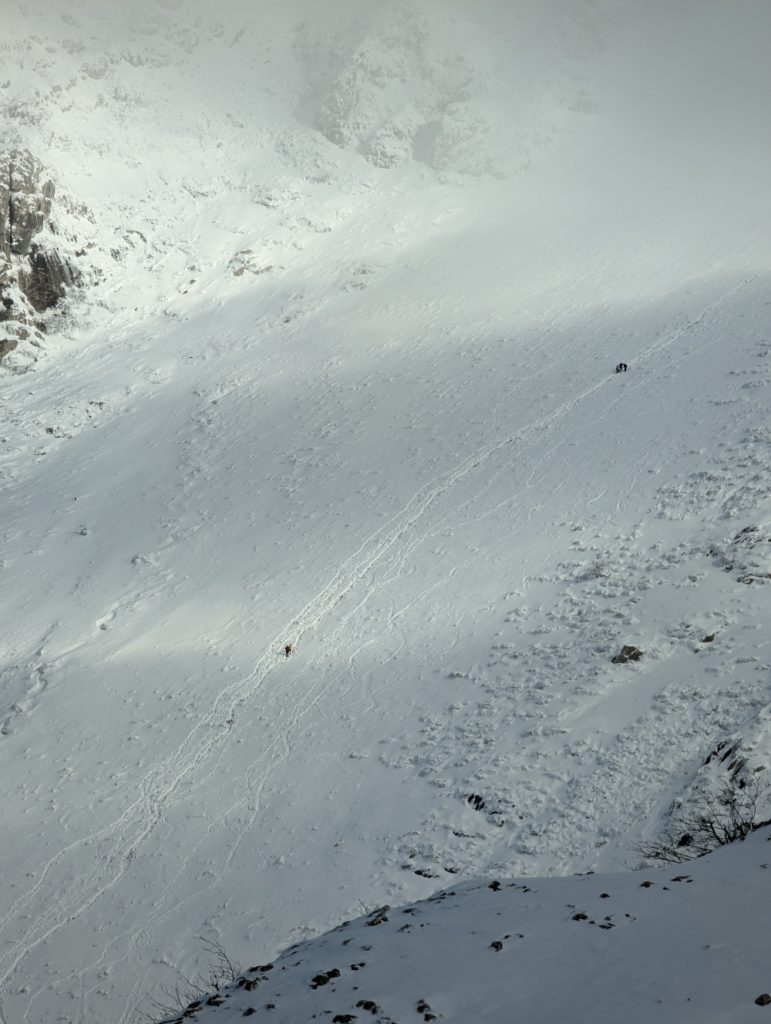 Descendemos con sumo cuidado, con los crampones puestos ya que la cantidad de gente que ha venido ha quitado y aplanado la nieve y hay puntos expuestos en los que el agarre es mínimo.