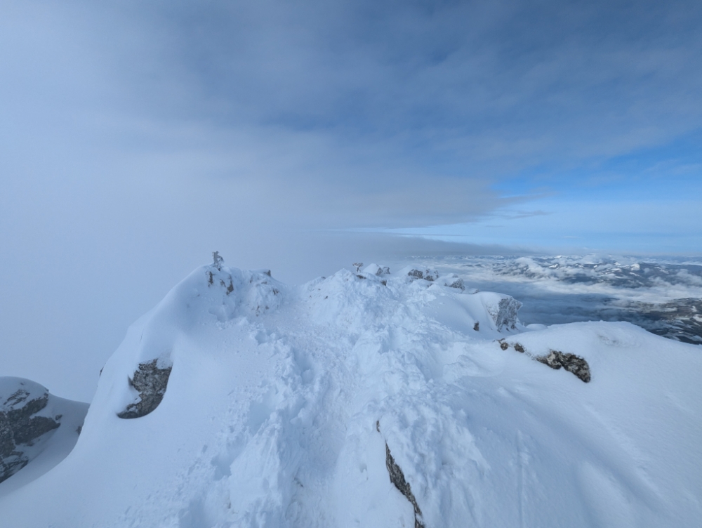 Nos unimos a la ruta normal, a media ladera entre el collado y la cima. Justo en el tramo que bordeamos las peñas cimeras por la derecha (Este). Una vez enfilamos la cima tendremos que tener cuidado con zonas algo expuestas.