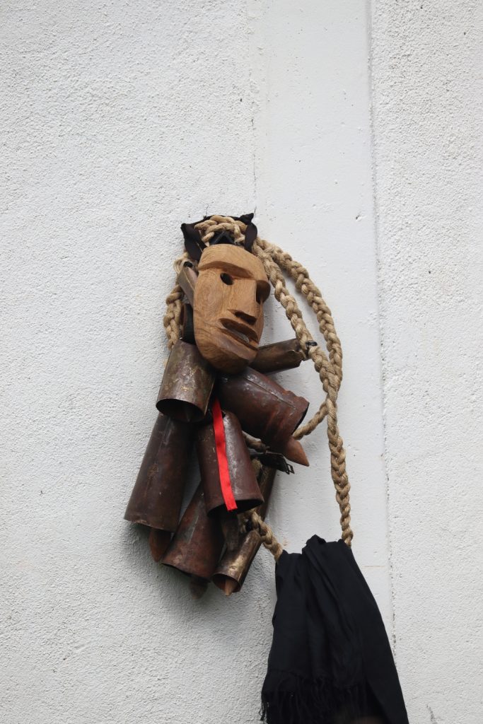 - En la cintura portan cencerros de mediano tamaño, sujetos a un cinturón de cuero negro con tirantes cruzados.