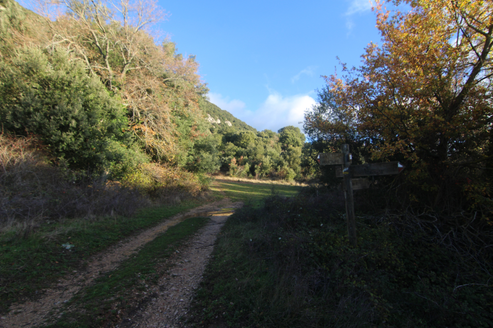 Transitando por el bajo en encinar, coloreado por el fruto rojizo del madroño, seguiremos en todo momento la señalización del GR-1 hacia el convento de Pierola. Y volveremos a salir de la espesura junto a fincas, antes de llegar al convento nos toparemos con una granja con un ruidoso perro.