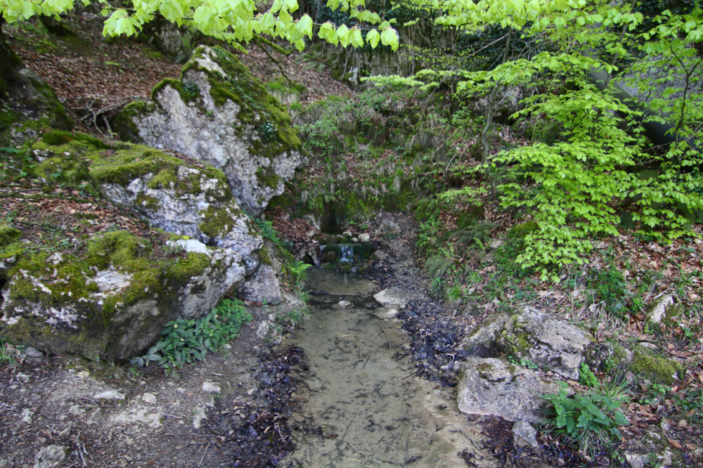 Salimos de las campas por el paso de la alambrada a nuestra izquierda y descendemos por la senda marcada, que en un primer momento pasa por una cavidad. Descendemos y nos internamos en el hayedo por una senda a nuestra izquierda, al poco tiempo oímos un rumor de agua y nos aproximamos al mismo, se trata del Nacedero del río Zadorra. Estamos en el lugar llamado manantial de Los Corrales.