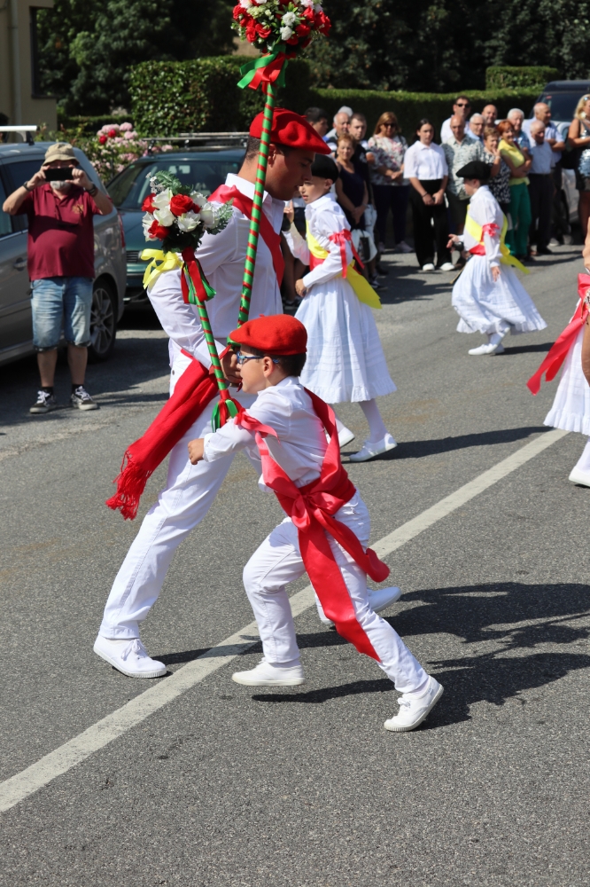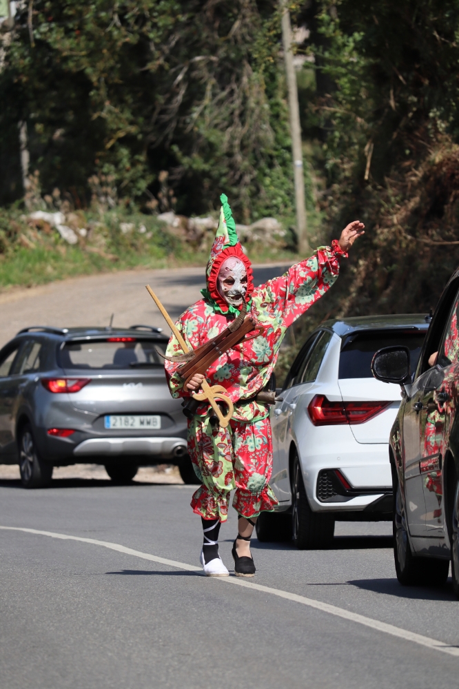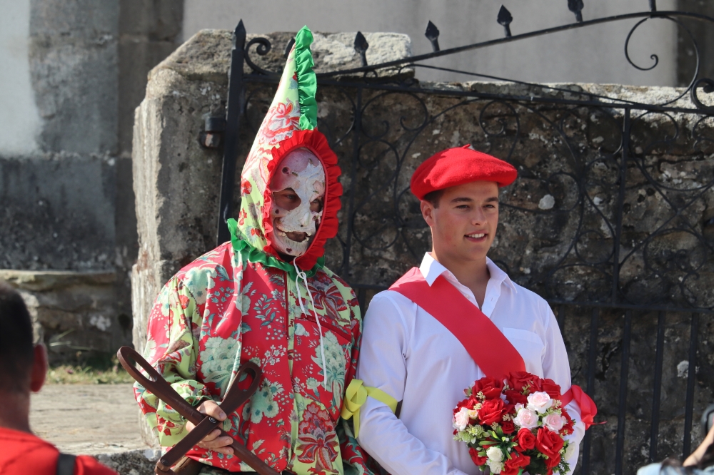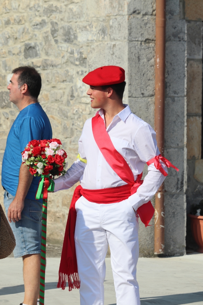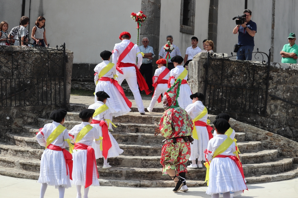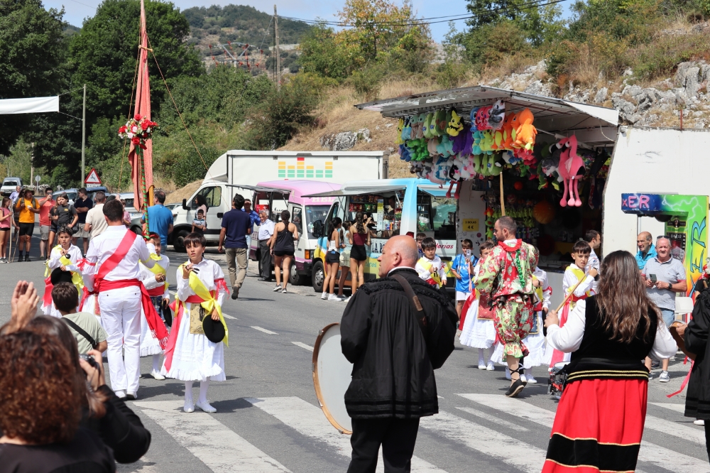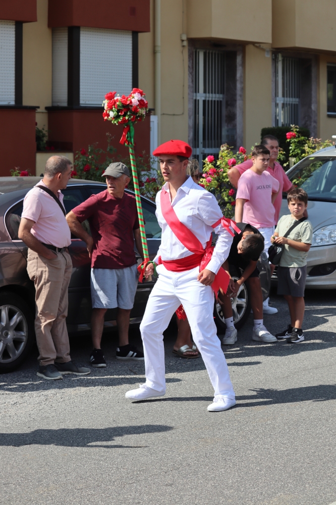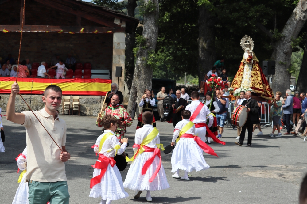 Tras esto comienzan a danzar para ir hasta la iglesia y entrar a por la virgen y el pendón para realizar la procesión por las calles del pueblo. Danzando siempre delante de la virgen estos mismos siempre de cara a la misma, el bobo en este momento se ha quitado la máscara y la capucha.