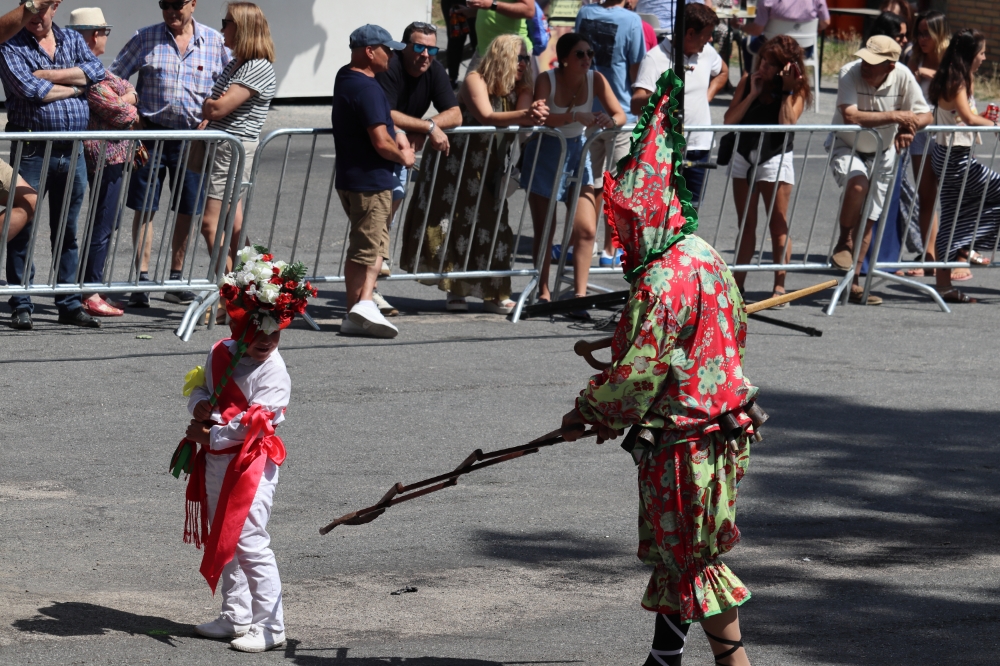 Después de la misa institucional, se va a la plaza “Campo de las Nieves” donde ya está todo el mundo. Entran todo el grupo de danzantes en la plaza y realizarán varias danzas: El Ahorcado realizando formaciones con varas de avellano de dos metros y el Pasacalles que es la que se ha interpretado durante toda la mañana pero en esta ocasión el Bobo le roba la dirección al Mayoral en parte de la danza.