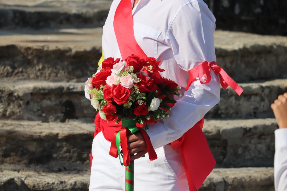 - Lleva un ramo de flores en la mano