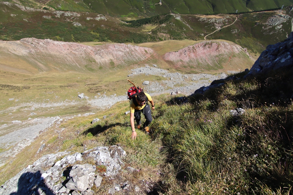 Subiremos por las trazas de hierba entre las rocas paralelos a los cortados verticales de la vertiente norte. Sin acercarnos mucho a dichas paredes seguiremos ascendiendo por el terreno más amigable, a mitad de subida tenemos un punto crítico ya que hay una zona con pocos agarres y sin muchas opciones. Pero con tranquilidad iremos ascendiendo.