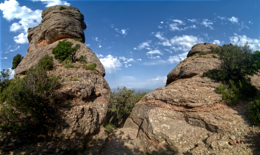 Cuando estamos bajo las grandes paredes de las agujas, con la Roca dela Gran Portella a nuestra derecha, tendremos la subida a la Portella, se trata de un portillo de montaña que da acceso a la parte interna de este sector de Montserrat. La subida es asequible usando los escalones seminaturales que hay y ayudándonos con las manos gracias a alguna piedra o raíces.