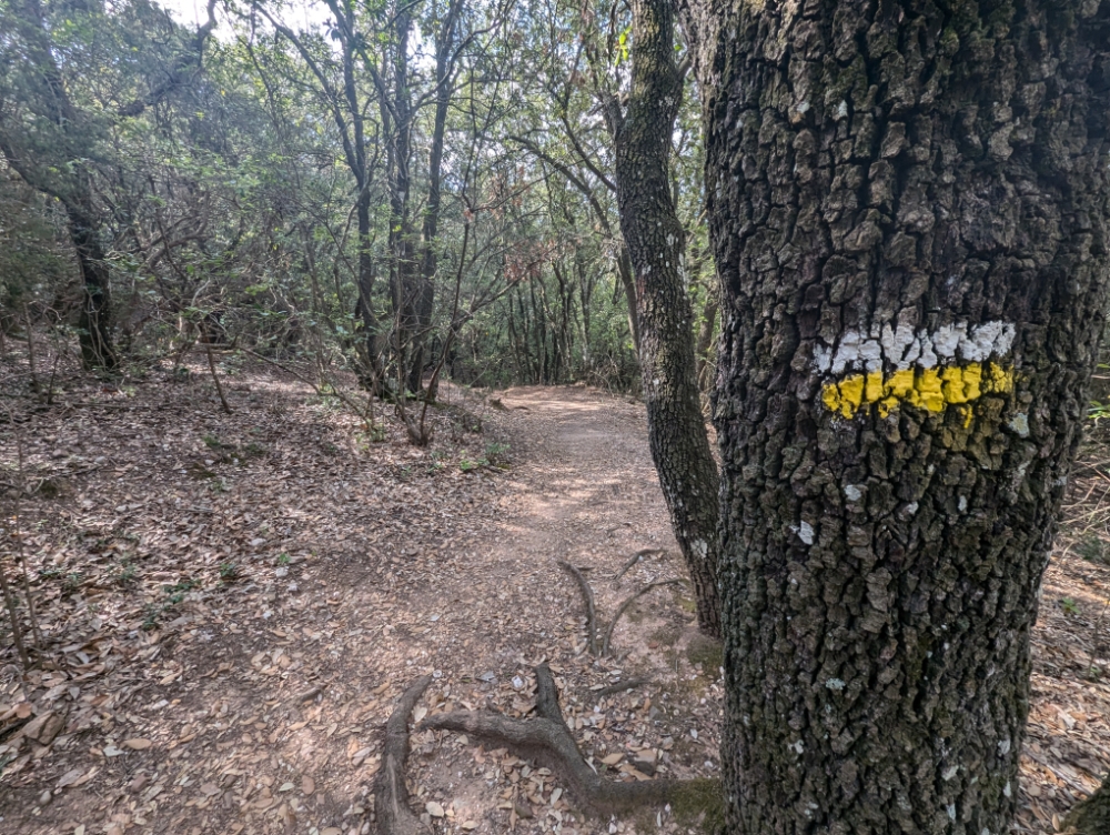 Nuestro camino no es vertical sino todo lo contrario, cada vez con más vegetación el camino desciende sin grandes desniveles. Hasta llegar a un cruce donde giraremos a la derecha y tras una bajada más intensa llegaremos al GR172 que va desde Can Maçana al monasterio de Montserrat.
